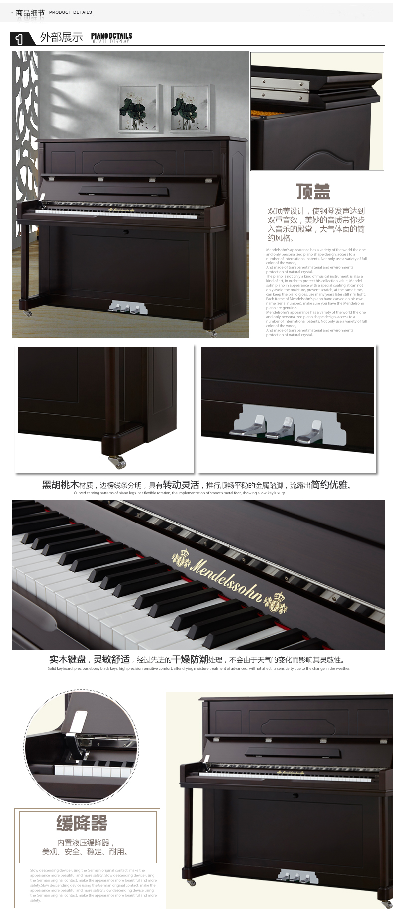 1.榔頭:擊弦槌采用德國進口mendelssohn專制優質尼氈,音色柔和優美