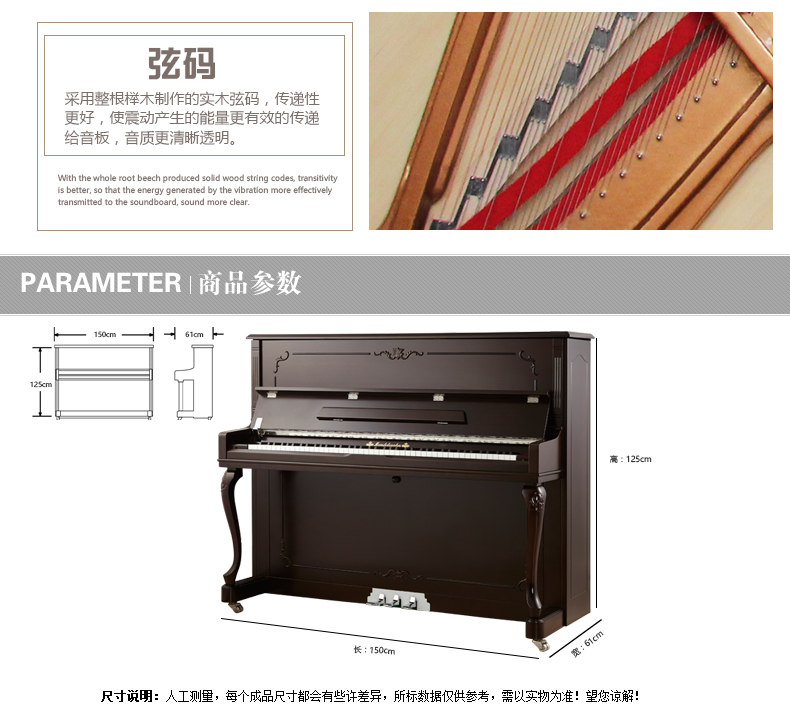 胡桃木色亞光琴身,大搖蓋,單琴耳,小譜架,大弧形彎腿雕有線形花紋,上、下門刻有精致的花枝、花蔓,盡顯浪漫、優雅。