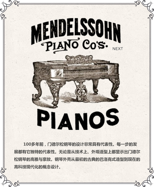 這是20世紀(jì)初誕生的門德爾松鋼琴。這個(gè)時(shí)期工業(yè)上有了較大的發(fā)展。在制造鋼琴方面也有了較先進(jìn)的機(jī)器輔助。制造的立式鋼琴外觀上給人簡(jiǎn)潔文雅,滿足了普通家庭演奏的需求,在客觀上注重外表的同時(shí),也注重了內(nèi)在的完美。