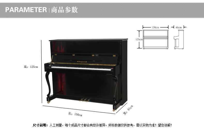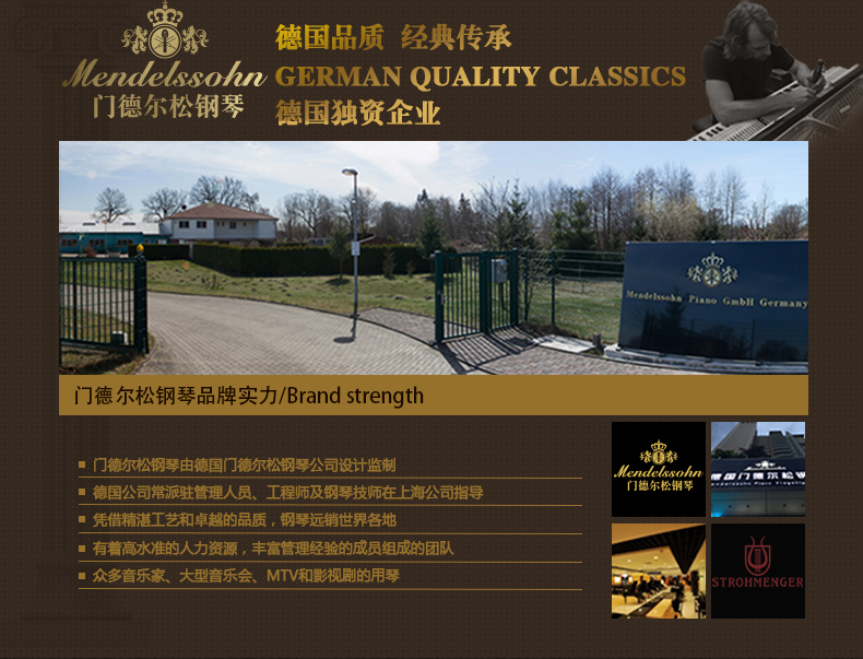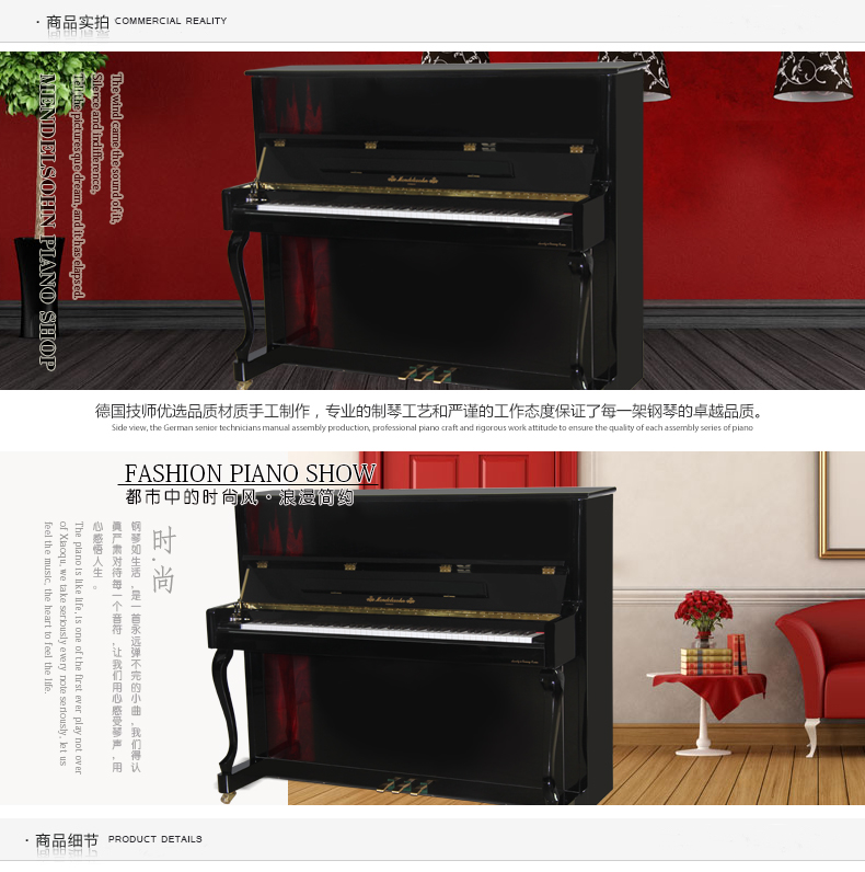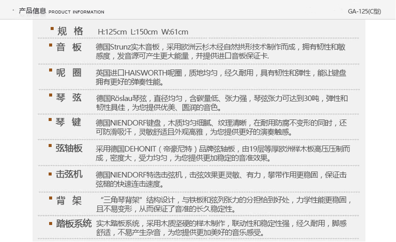 采用彰顯尊貴的歐式外型設計,精選高品質材質,雅致外觀與超凡音質相結合。德國高級技師手工組裝制作,專業的制琴工藝和嚴謹 的工作態度保證了每一架進口系列鋼琴的卓越品質。同時,每一架進口系列鋼琴在出廠時都須經過嚴格的檢驗、調試、整理,保證每位 使用者都能感受到它的純真的音質。