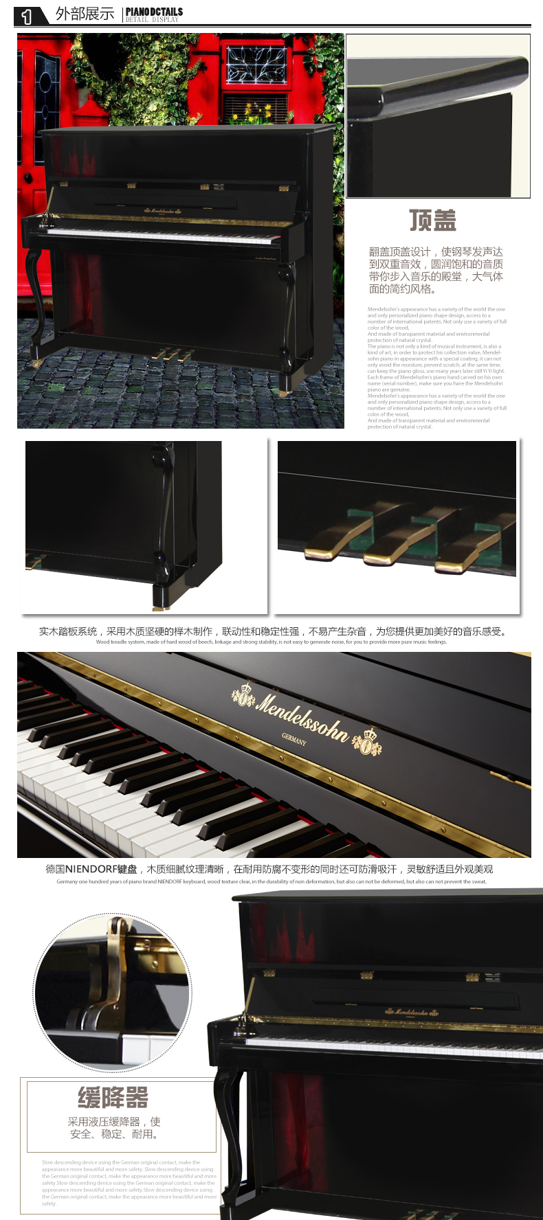 擊弦機:德國鋼琴品牌NIENDORF特選擊弦機,擊弦效果更靈敏、有力,攀帶作用更穩固,保證擊弦槌的快速連擊速度。