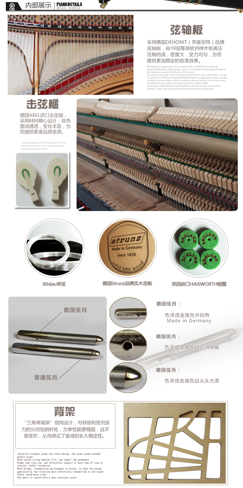弦軸:德國鋼琴弦軸,質地均勻,不易斷裂,具有高精度和光滑度的特點。專業性強,與弦軸板組合更加嚴密,可承受琴弦的最大 張力,不易松動,為您提供更加穩定的音色。