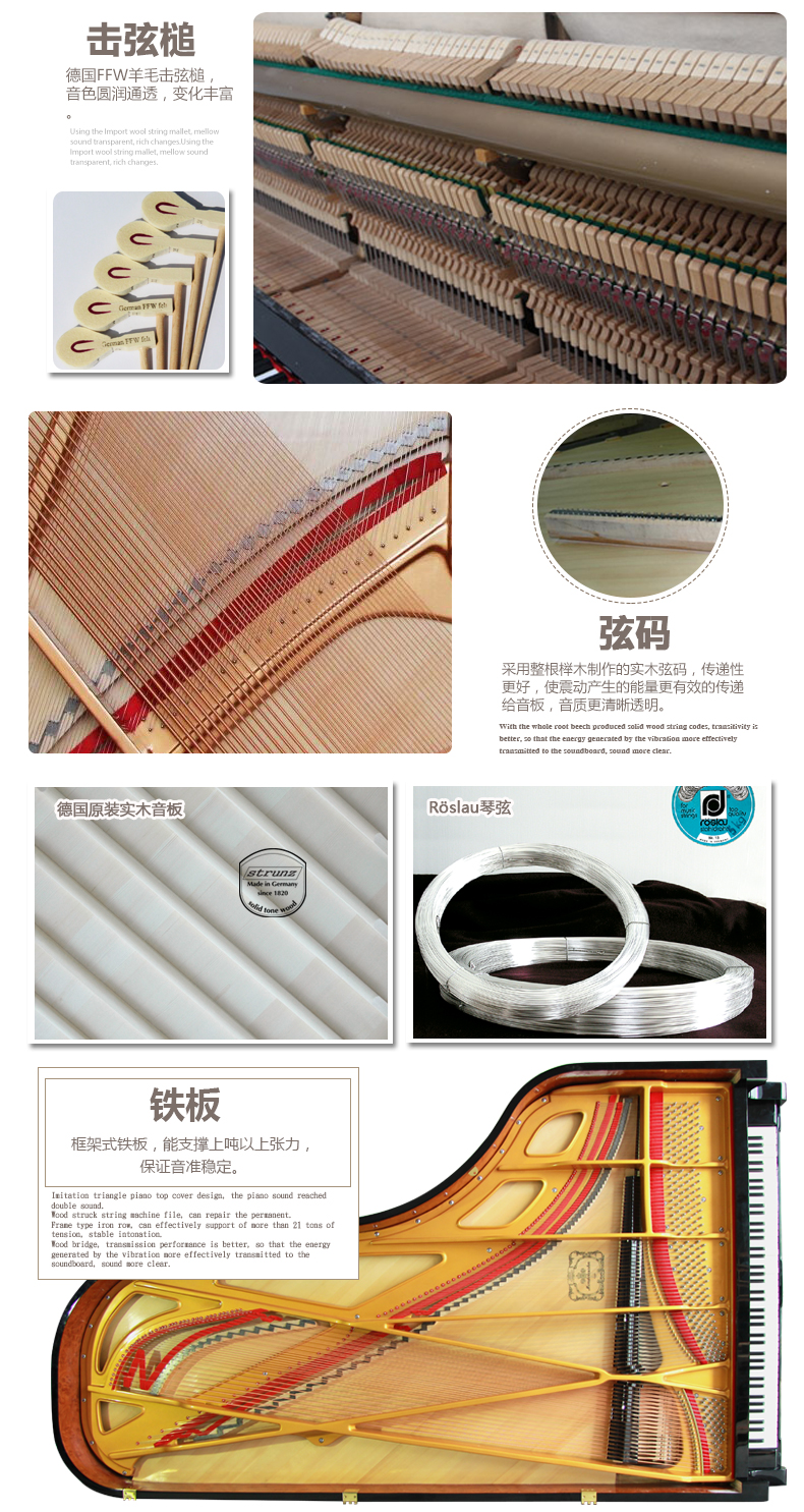 德國R?slau(羅斯勞)琴弦、德國FFW羊毛擊弦槌、德國原裝進口音板。