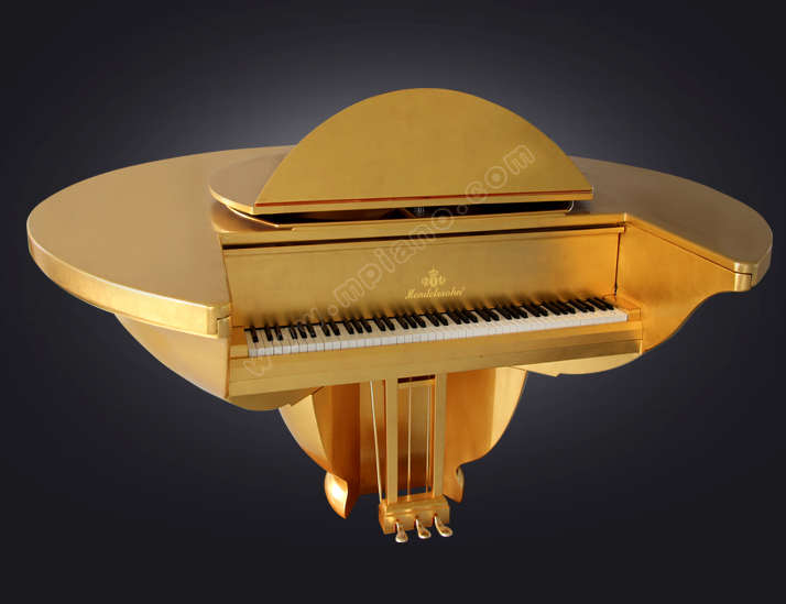 “金玉滿堂”鋼琴的設計理念源于對中國傳統文化和歐洲古典鋼琴藝術的融合。鋼琴外觀形如一個大大的餐桌,上層宛若一個金燦燦的“聚寶盆”,寓意著豐收,含吉祥和富貴之意。鋼琴,也可以當作餐桌使用,當你在如此優雅的鋼琴餐桌上用餐時,一邊是色香味俱全的美食,一邊是“餐桌”所流淌出那美妙的天籟之音,盡情體驗味覺、視覺和聽覺上的三重享受…… 整架鋼琴高980mm,最大直徑2420mm,表面由純金(箔)打造,德國工藝純手工制作,適用于高檔會所及星級酒店等高檔場所使用和收藏。